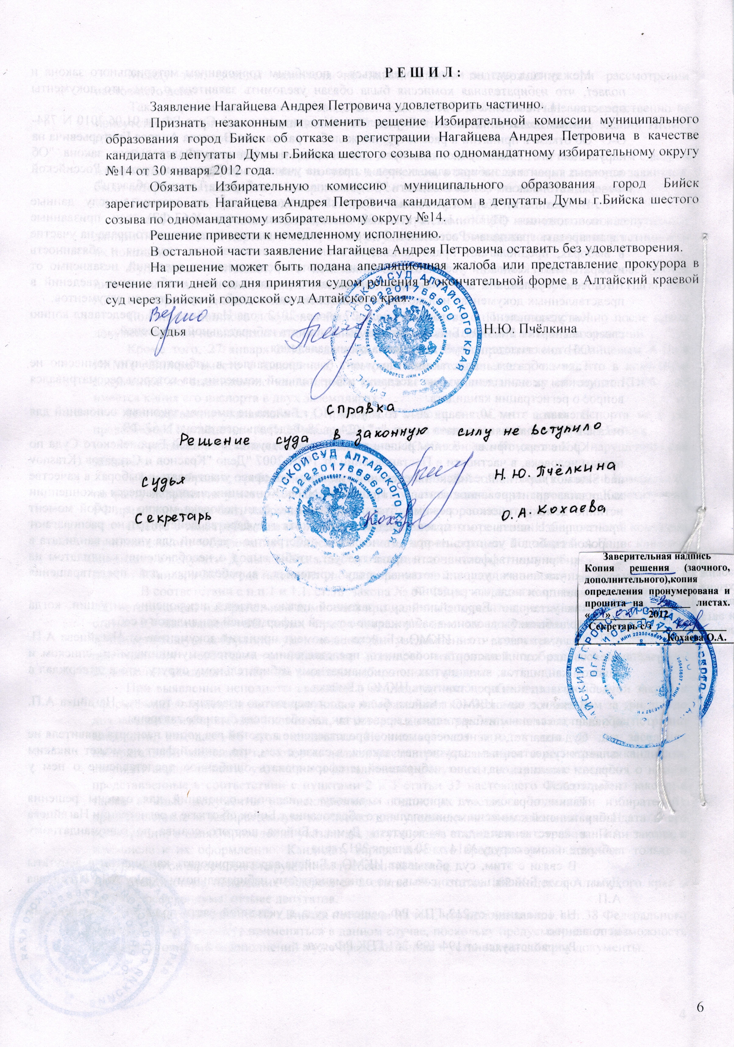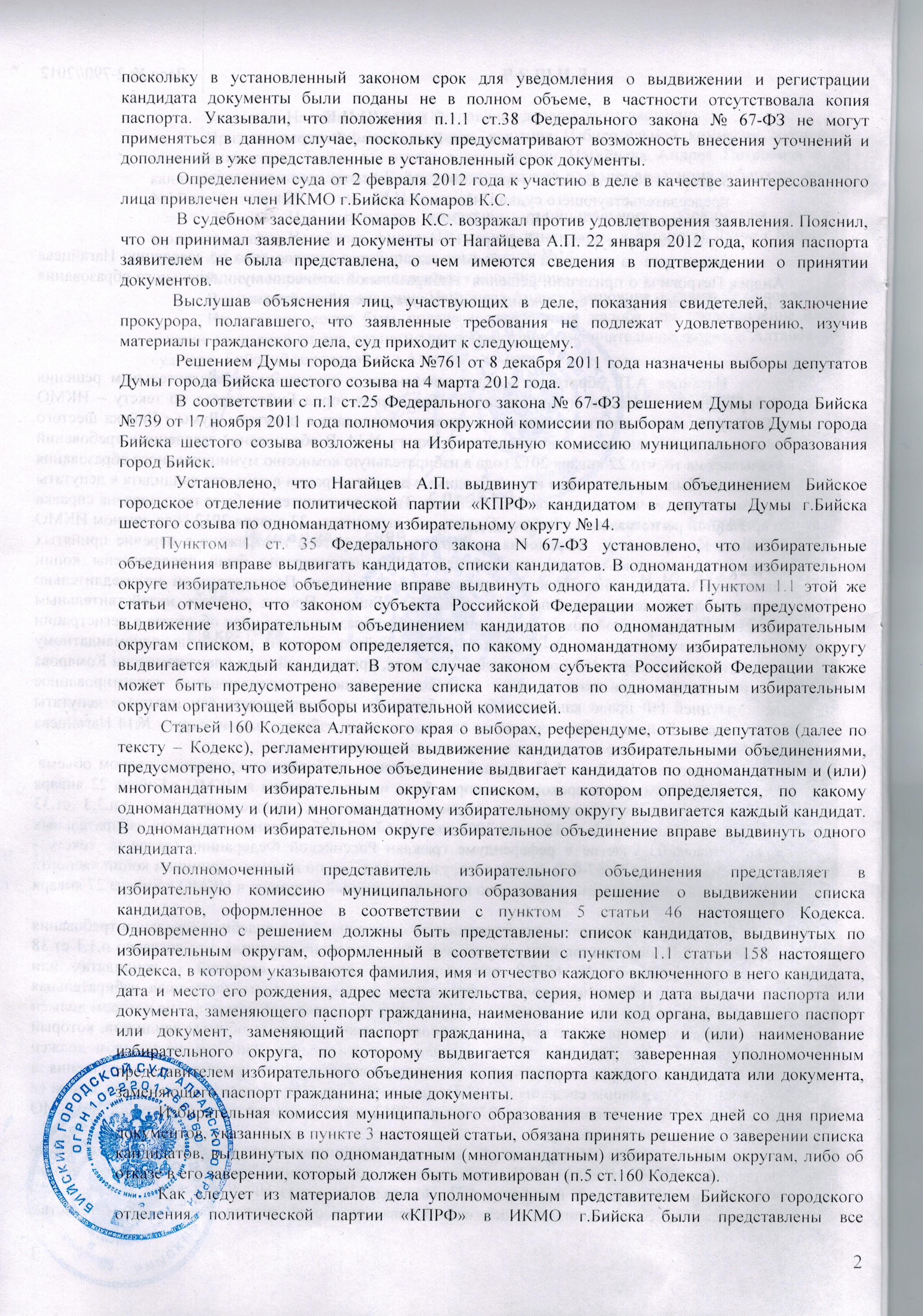 3 февраля 2012 года Бийский городской суд признал незаконным отказ избиркома города в регистрации кандидата в депутаты Думы города Бийска от КПРФ А.П. Нагайцева. Уже 4 февраля 2012 года, на заседании, избирательная комиссия зарегистрировала Нагайцева по одномандатному округу № 14, выдав соответствующее удостоверение.